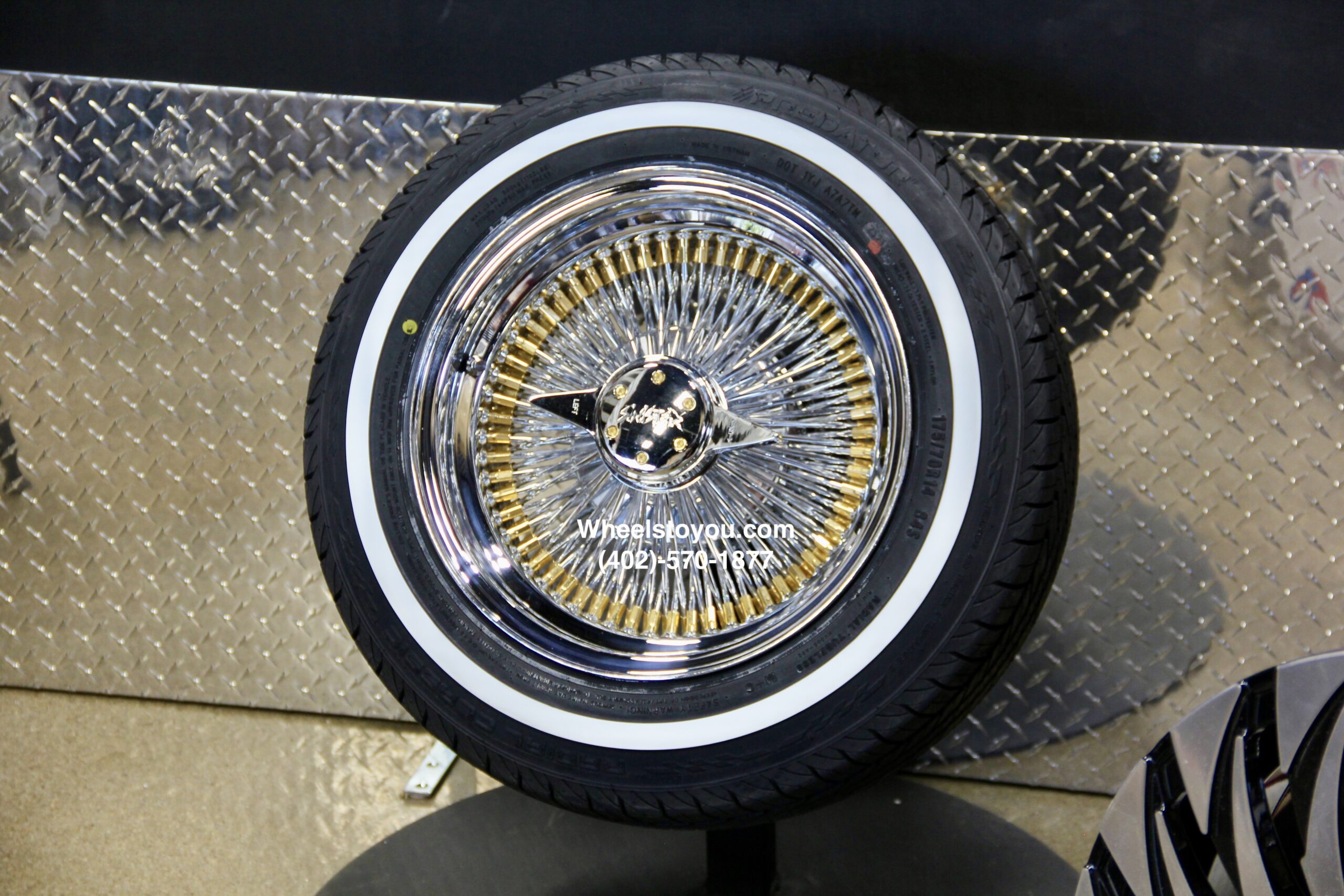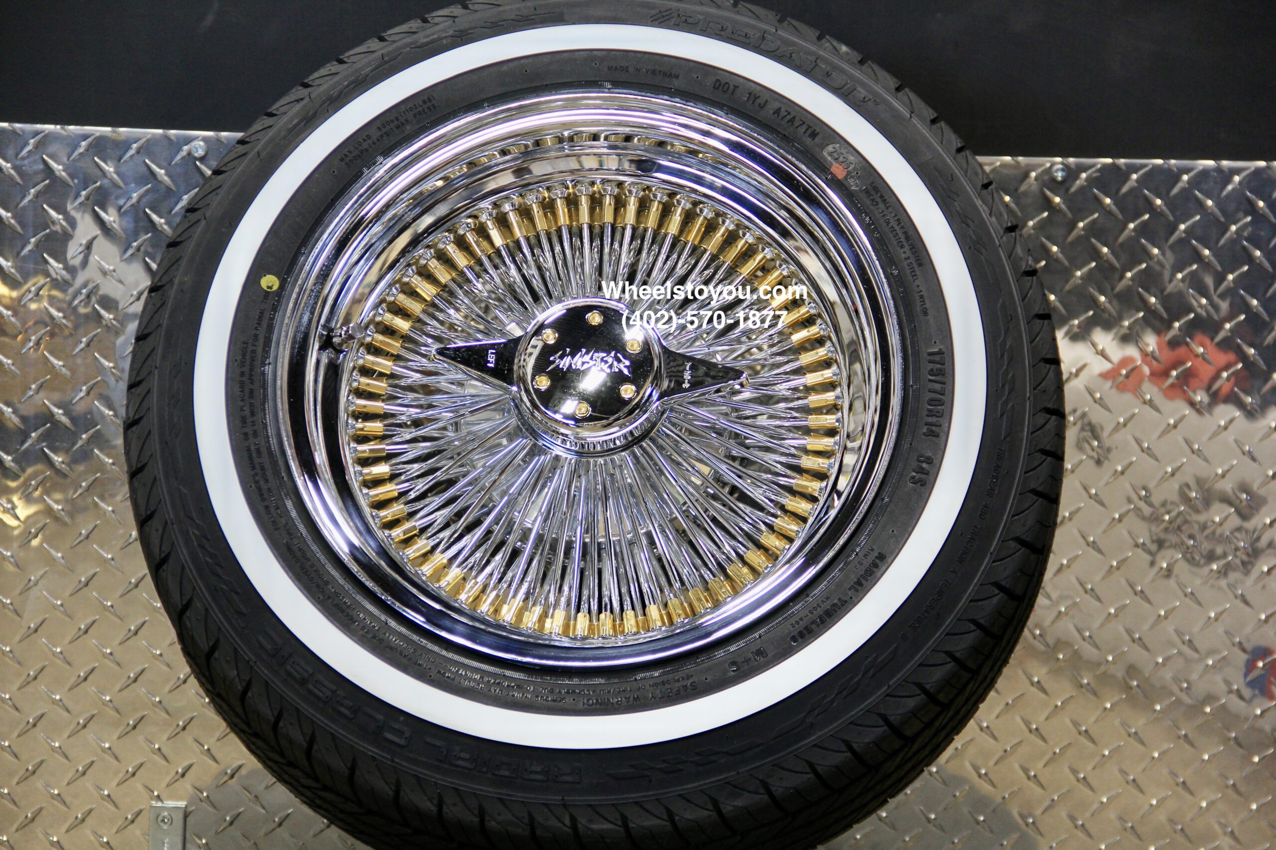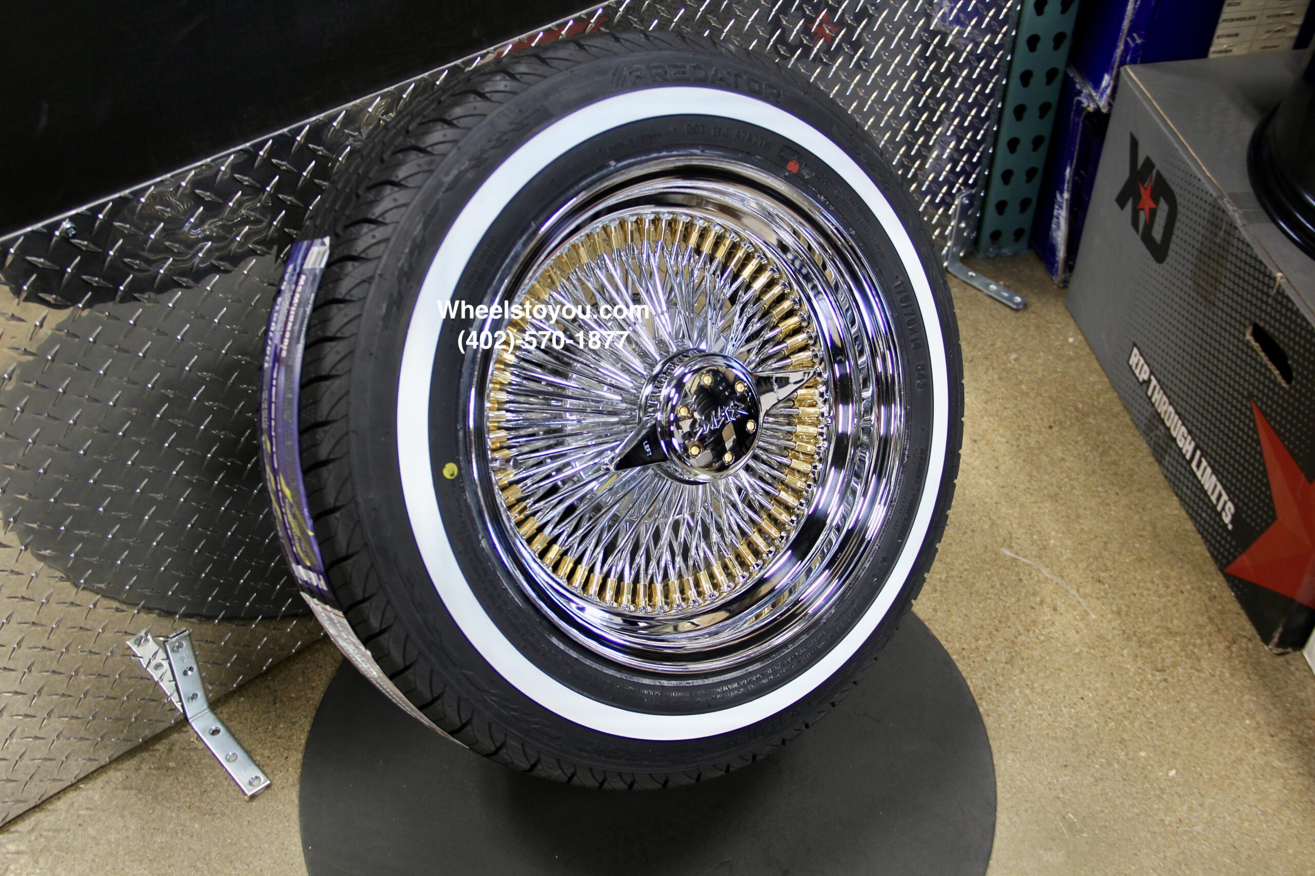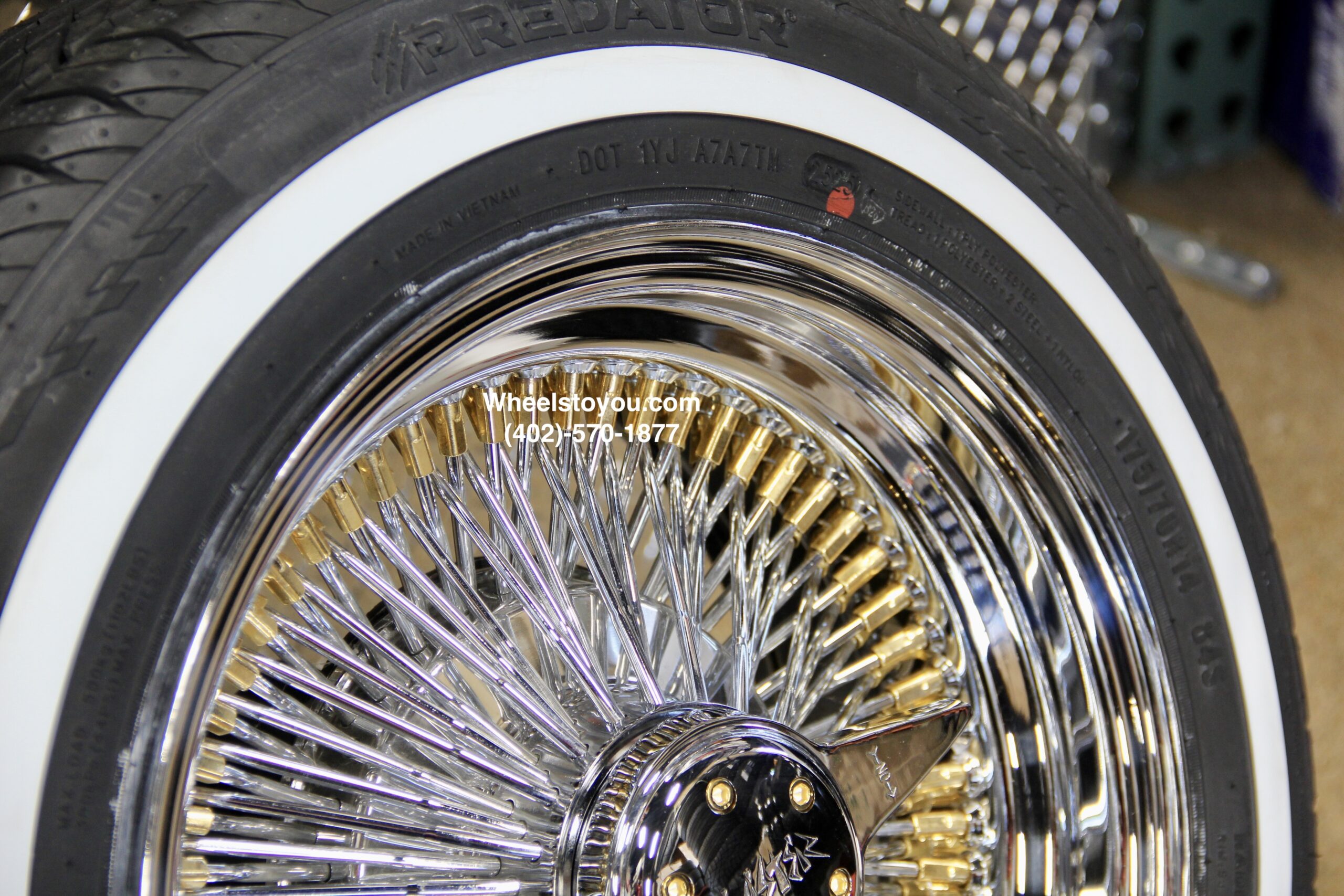 THIS NEW SET OF FOUR (4) 14″ 132 SPOKE Gold & CHROME WIRE WHEELS & Whitewall Tire package is READY TO GO!