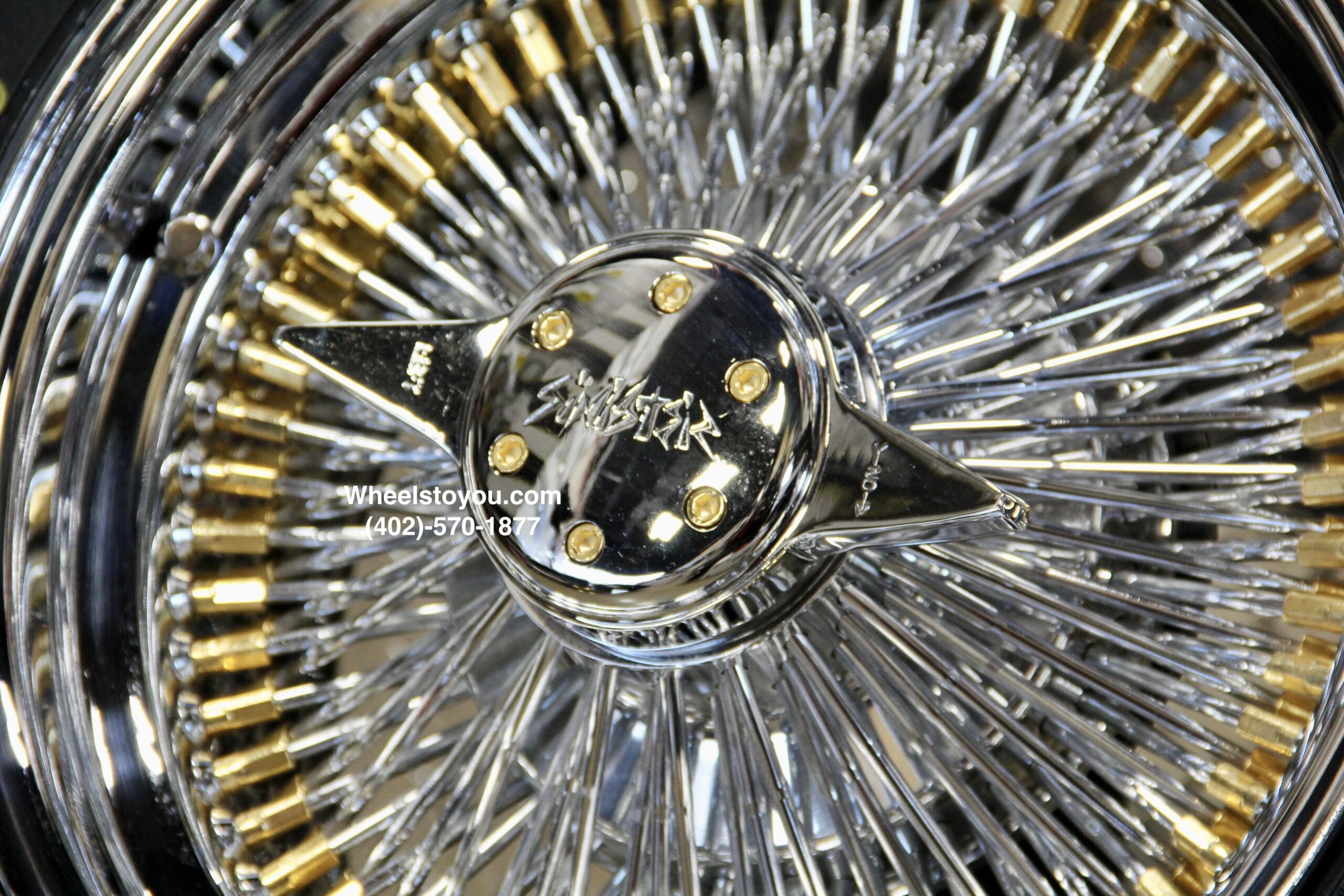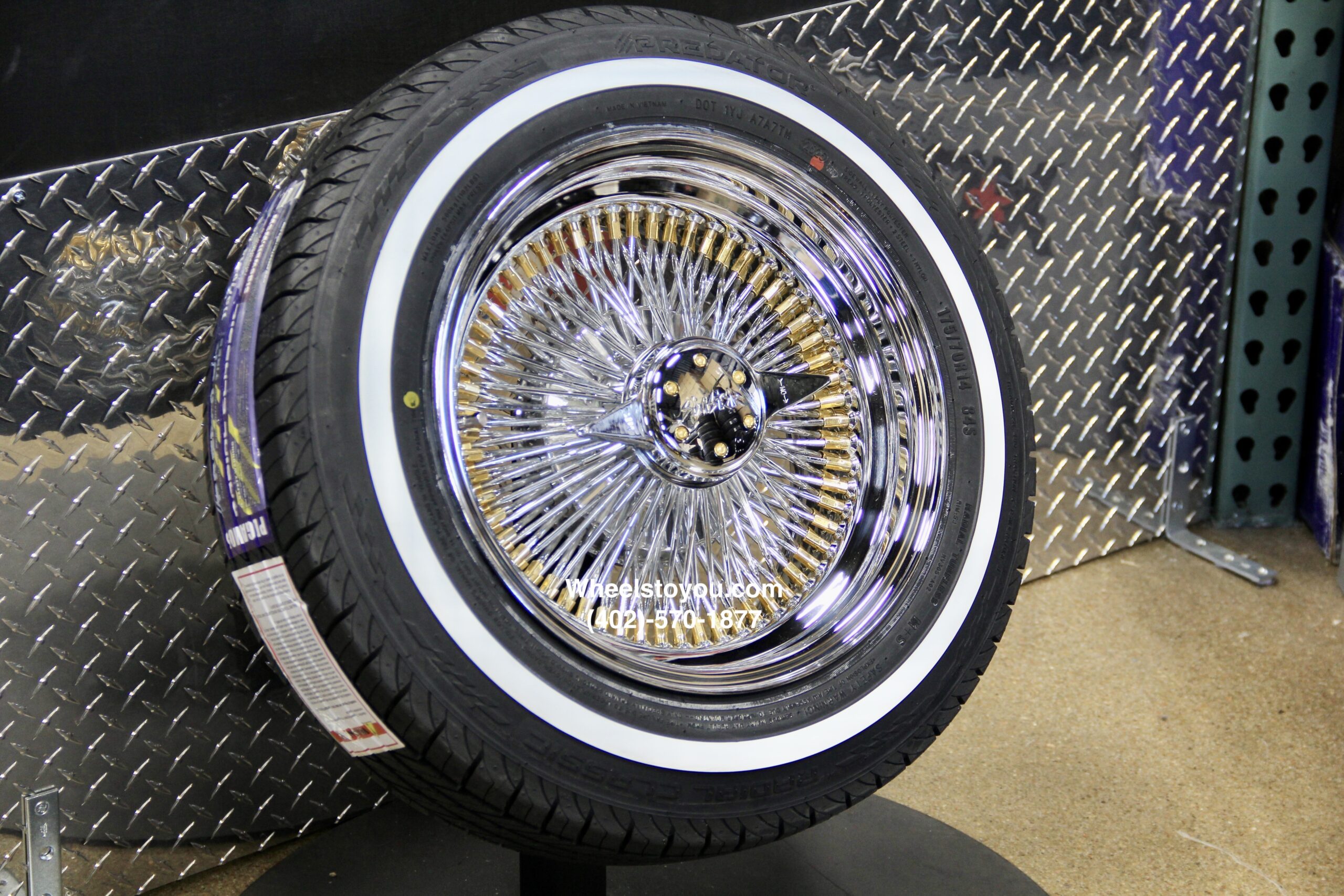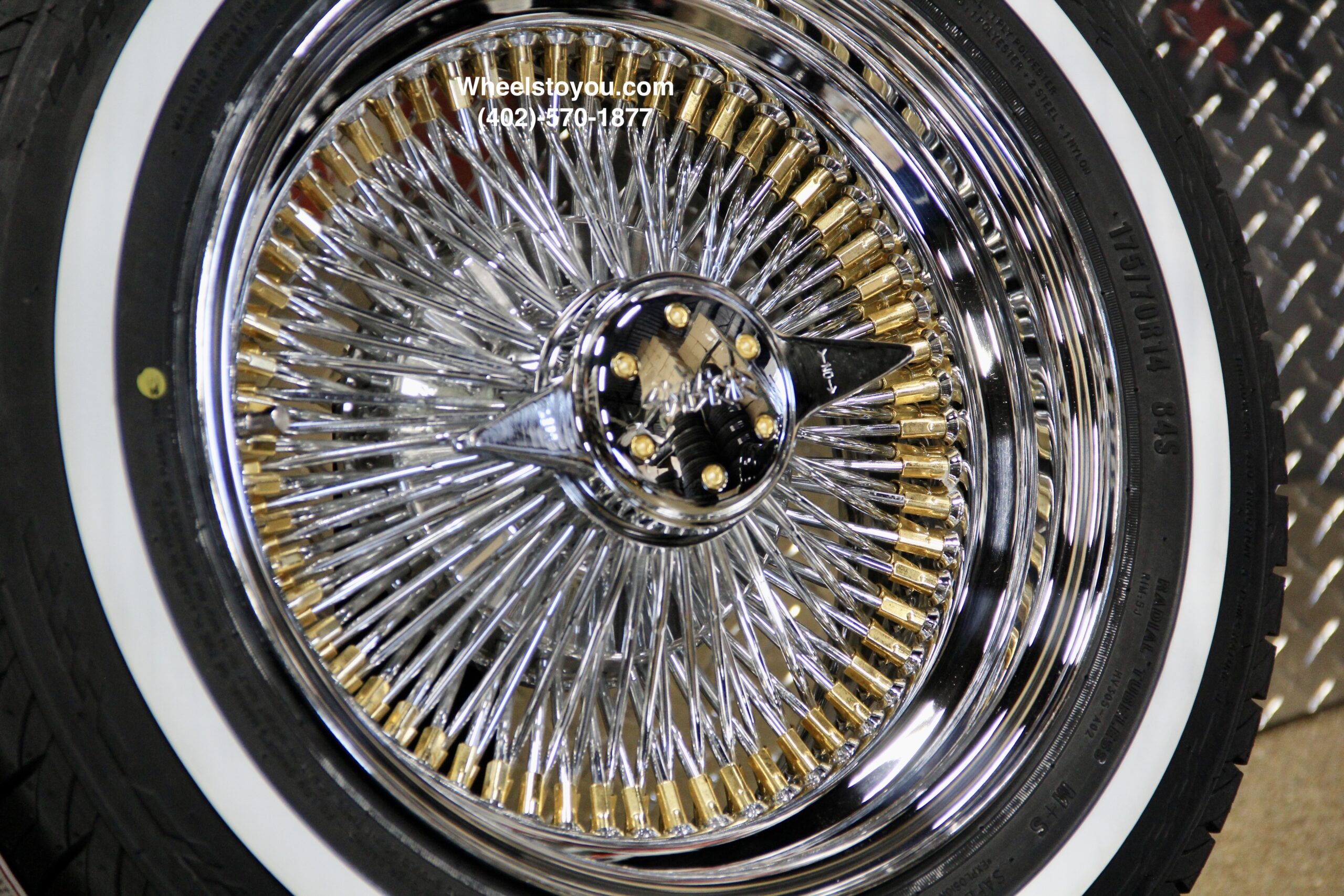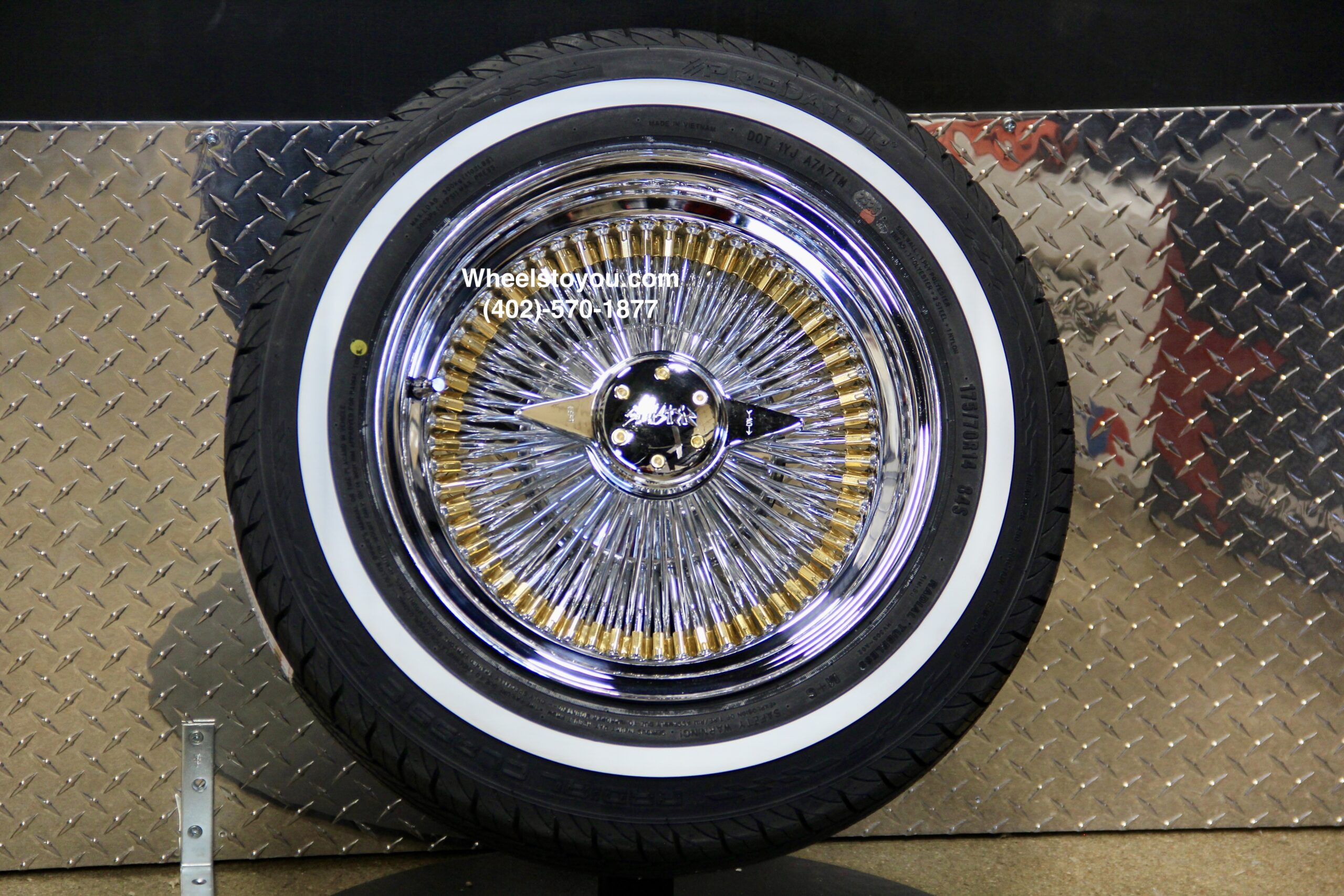 THIS NEW SET OF FOUR (4) 14″ 132 SPOKE Gold & CHROME WIRE WHEELS & Whitewall Tire package is READY TO GO!
