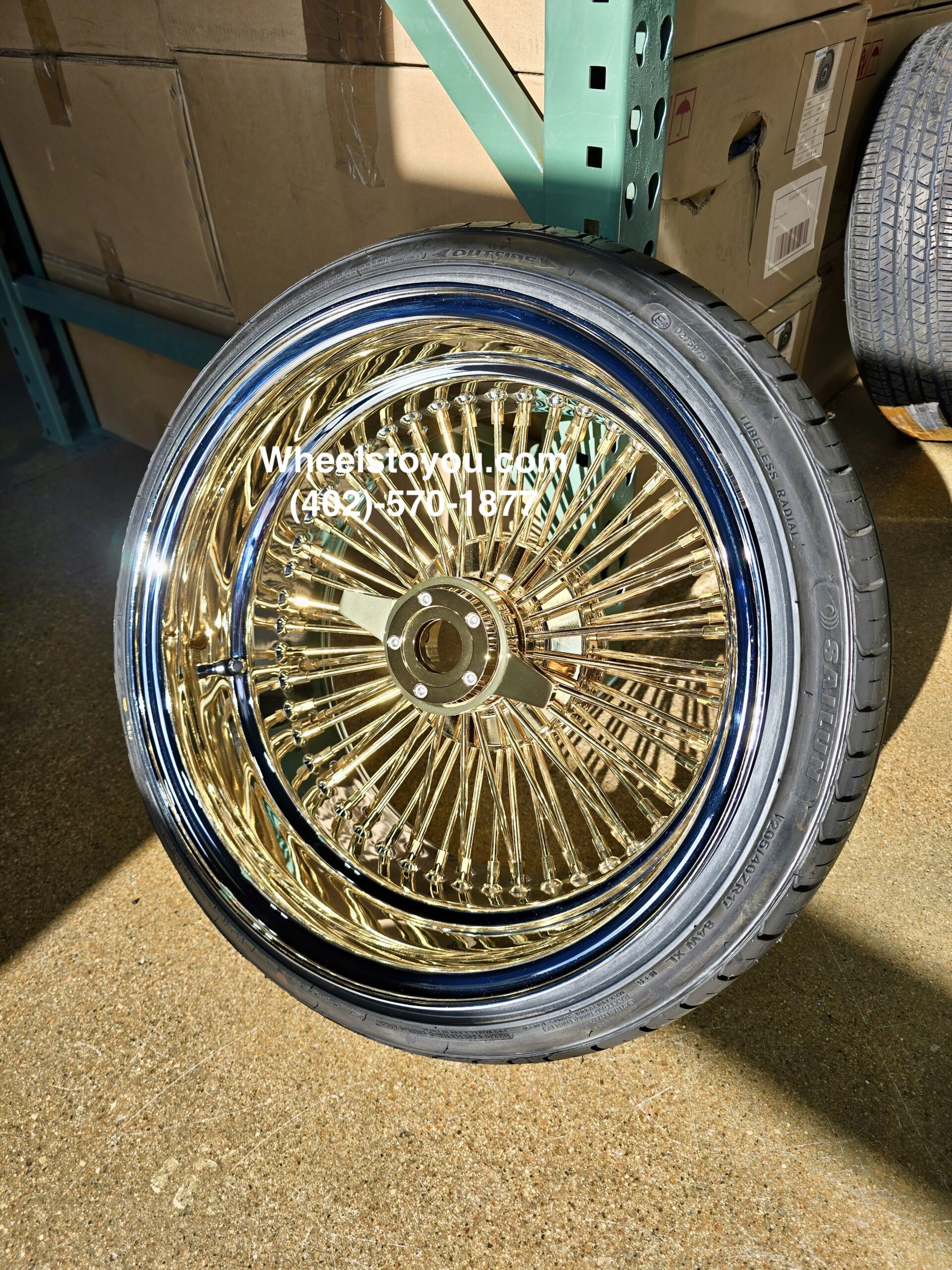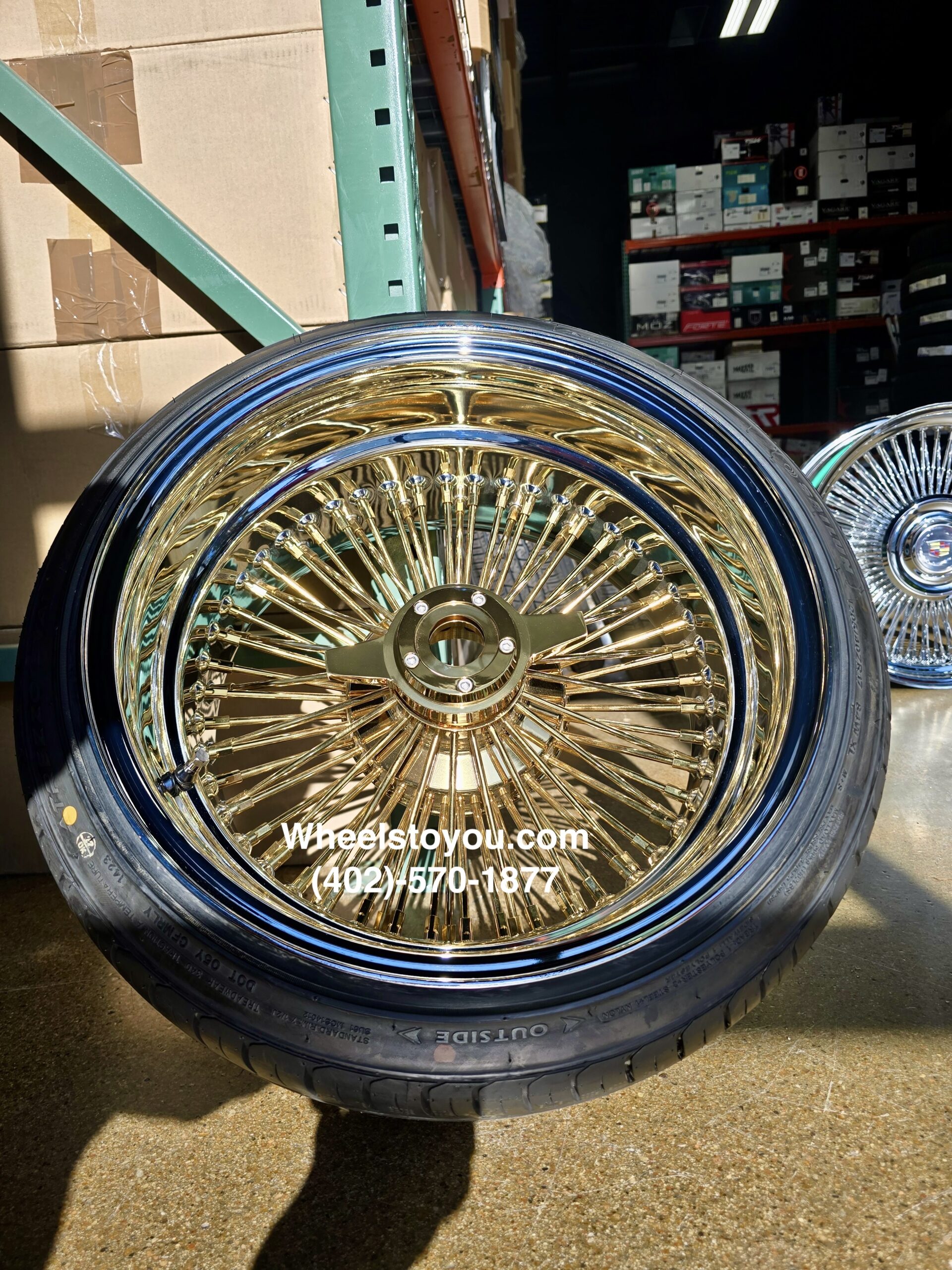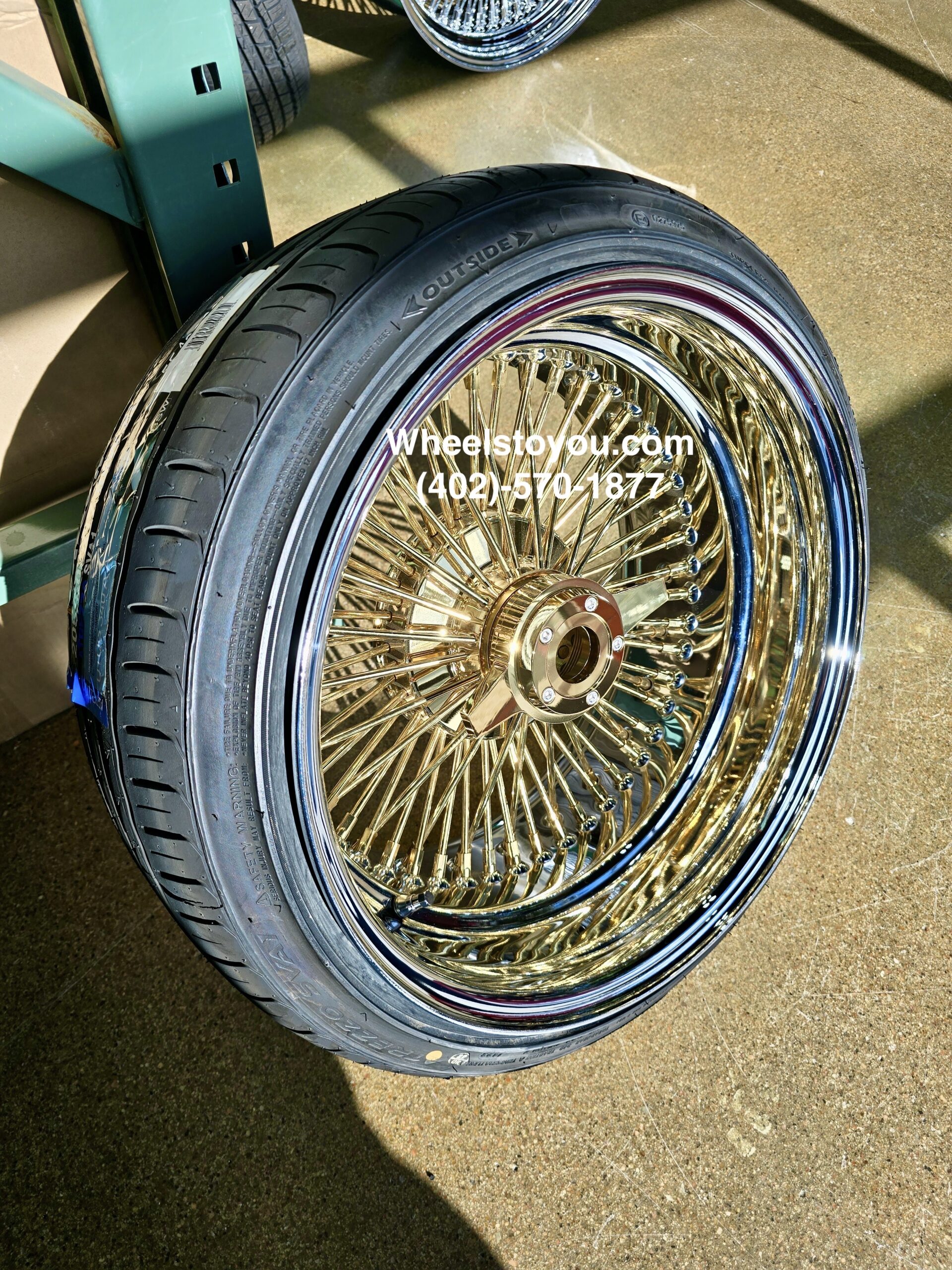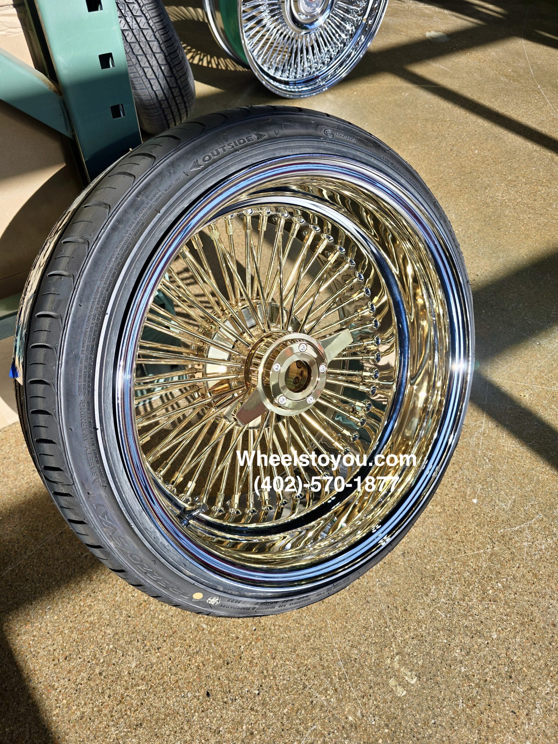 New Set (4) 17 X 9″ GOLD & CHROME DEEP DISH 72 SPOKE STRAIGHT LACE KNOCKOFF WIRE WHEELS & LOW PROFILE TIRES SET (4) WITH 2 Wing Locking KO *no Adapters*