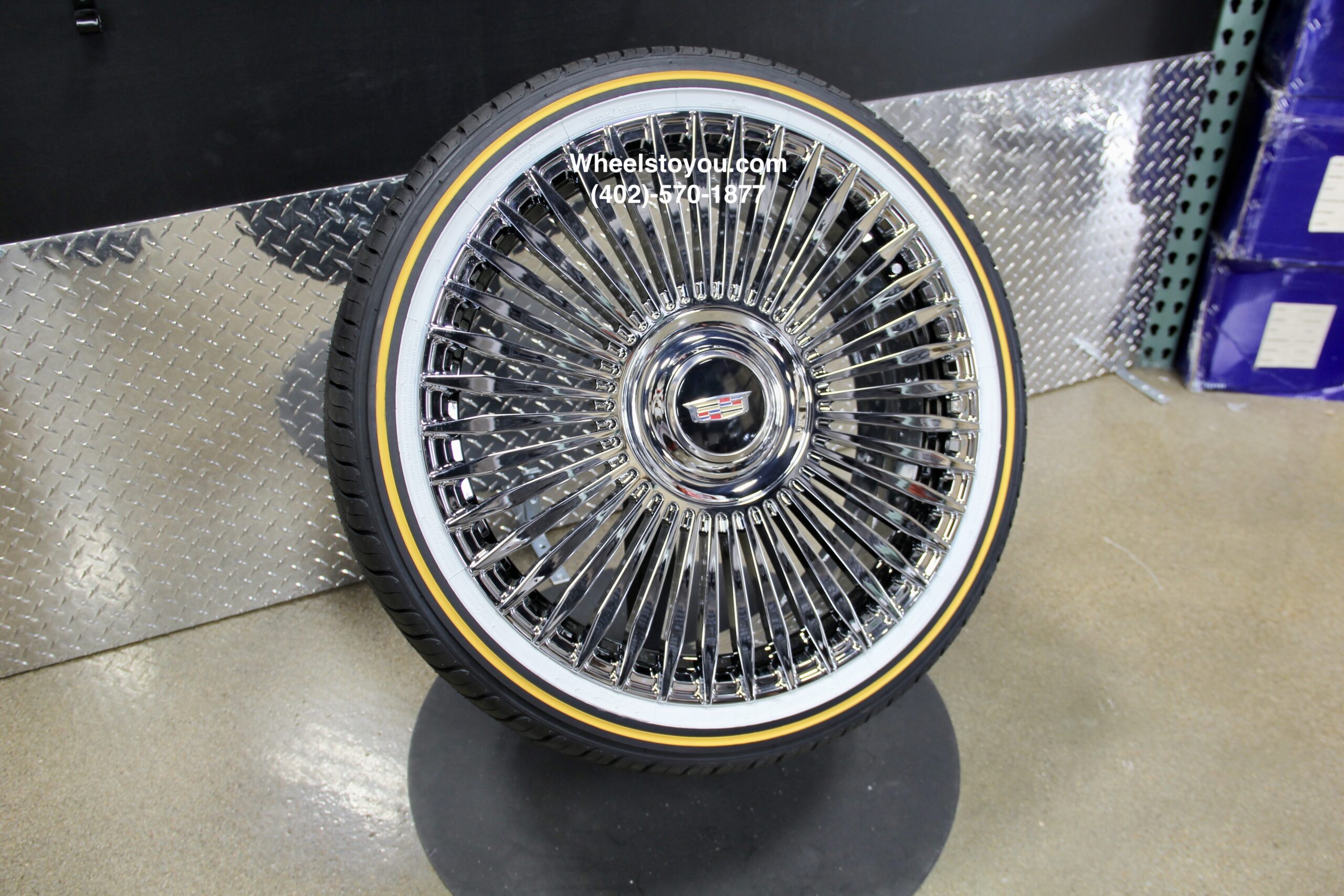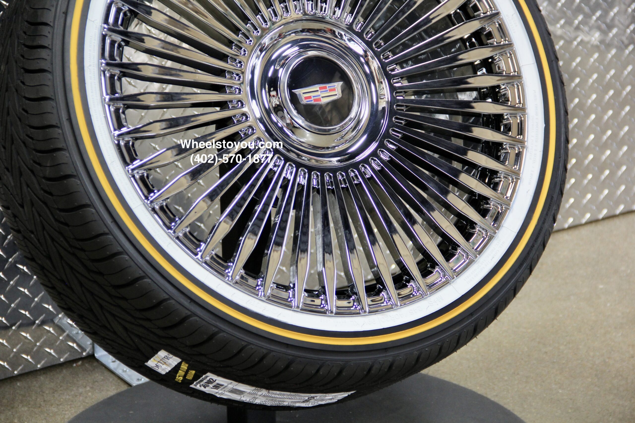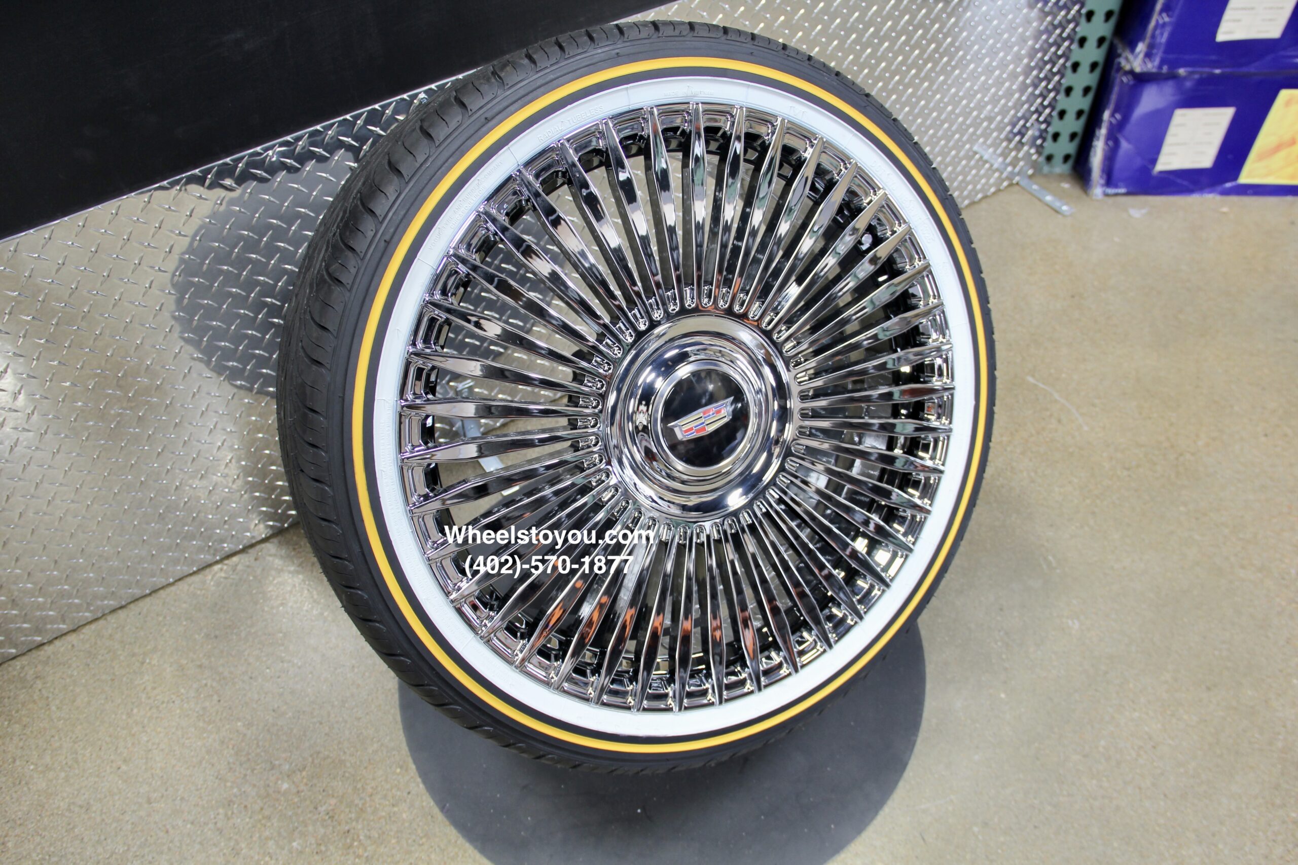 New Set (4) 22″ Chrome Cadillac Floating Cap Forged Spear Wheels and 285-45-22 Vogue Whitewall / Yellow Stripe Tire Complete Package Set (4) Fit Cadillac Escalade 6×139.7 6×5.5 Trucks / Suvs