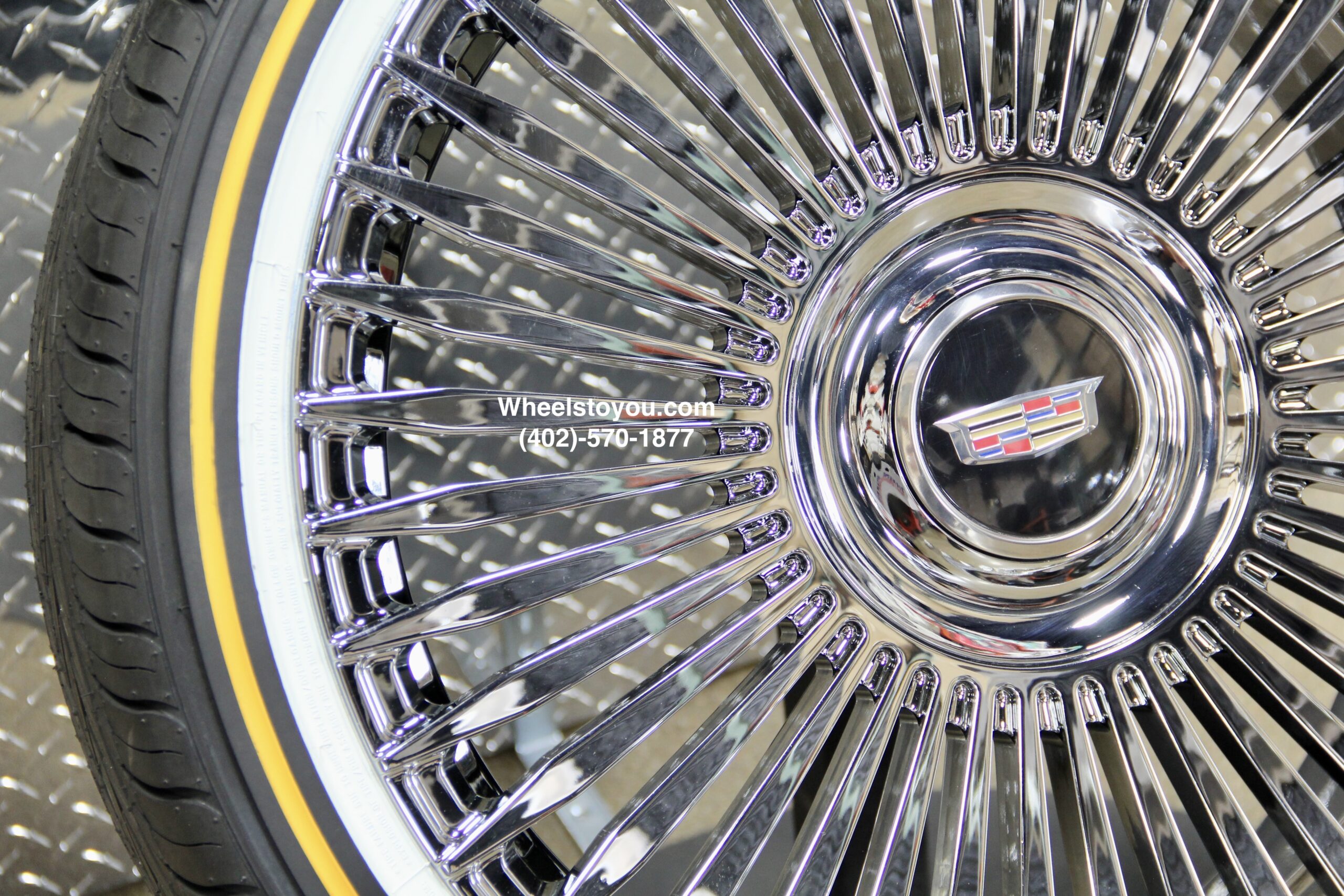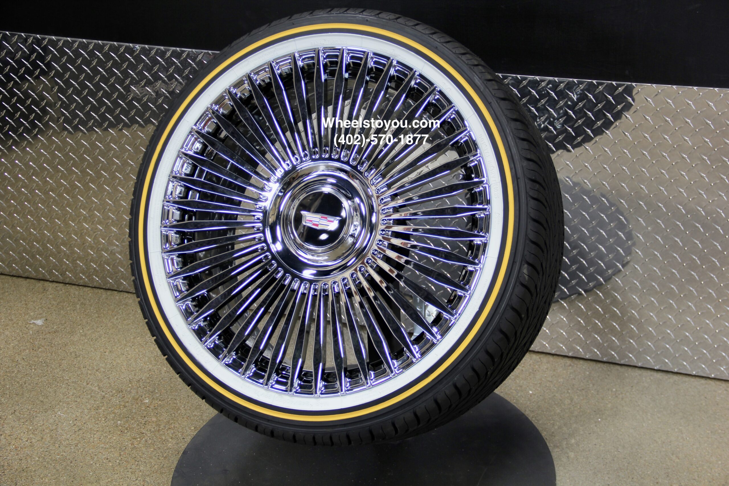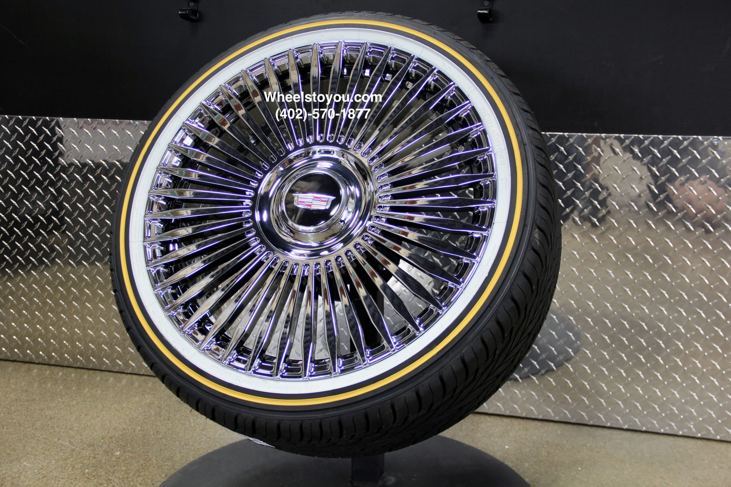 New Set (4) 22″ Chrome Cadillac Floating Cap Forged Spear Wheels and 285-45-22 Vogue Whitewall / Yellow Stripe Tire Complete Package Set (4) Fit Cadillac Escalade 6×139.7 6×5.5 Trucks / Suvs