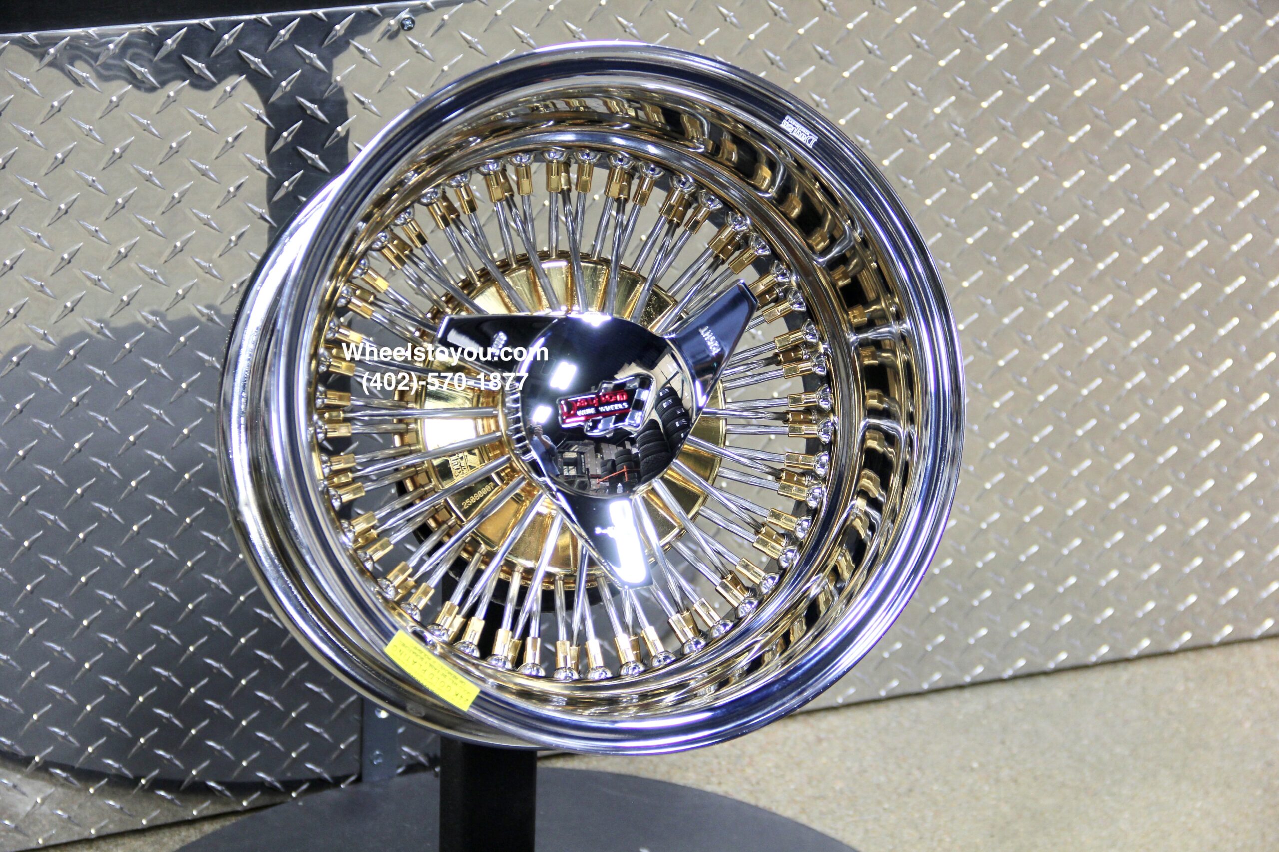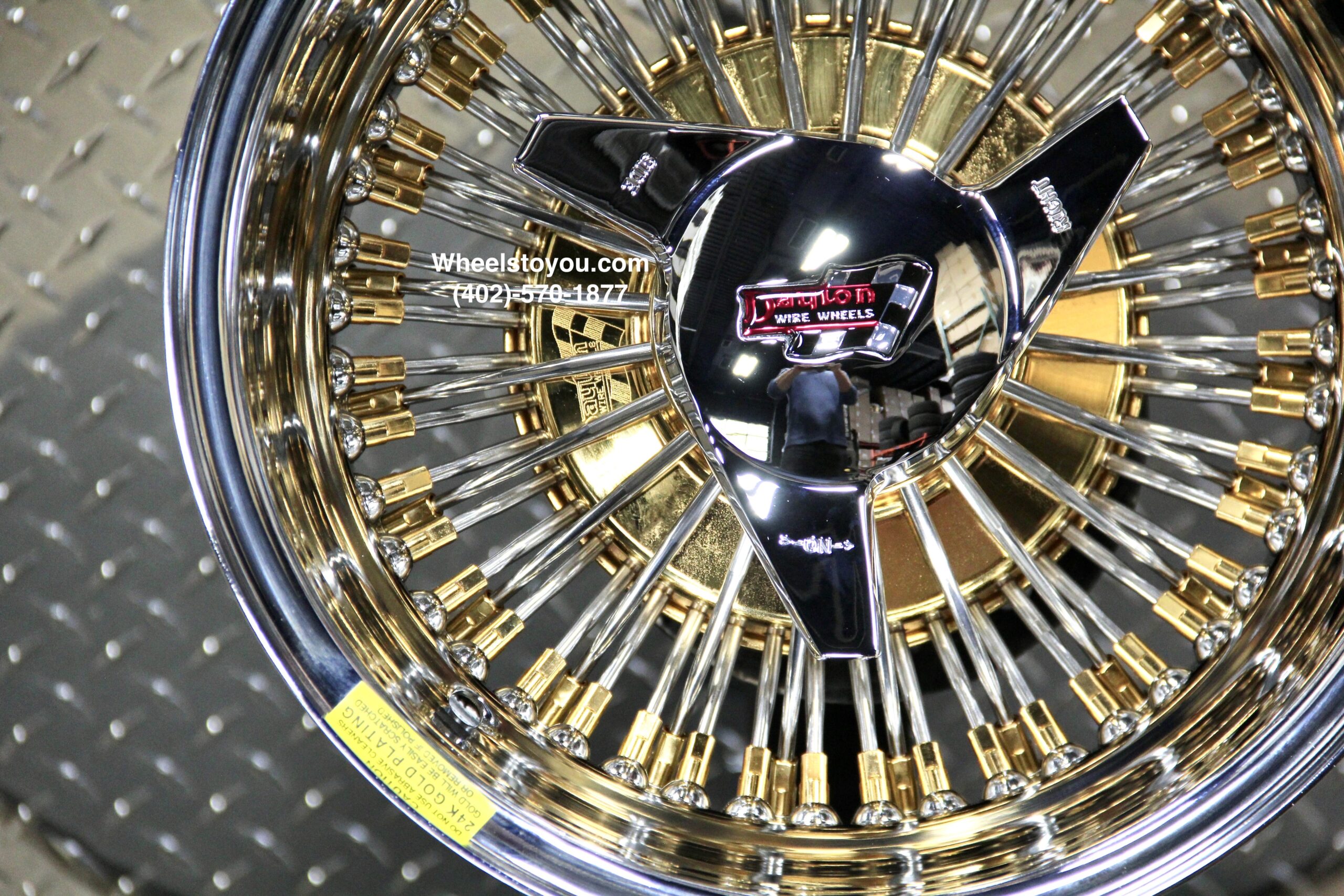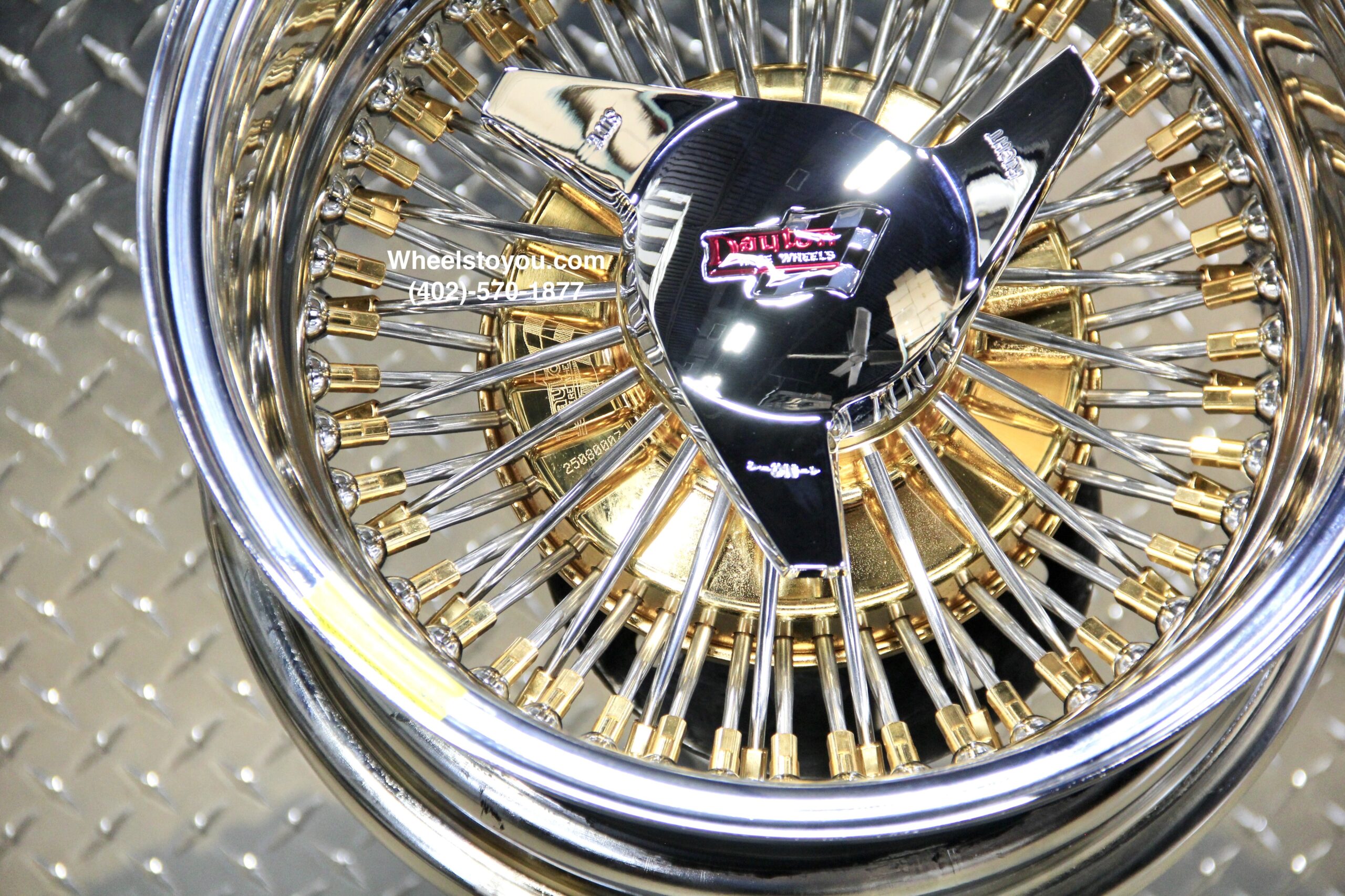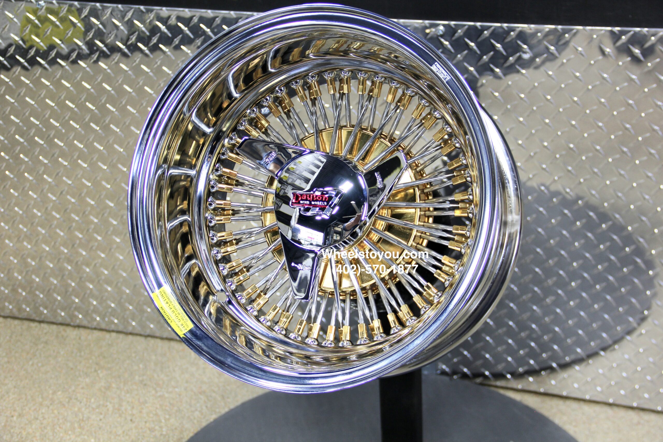 New Set (4) Genuine Dayton Stamped 13×7″ Deep Dish 72 Spoke 24kt Gold Hub & Nipples With Stainless Steel Spoke Lowrider Knockoff Wire Wheels Set of four (4) with Hardware